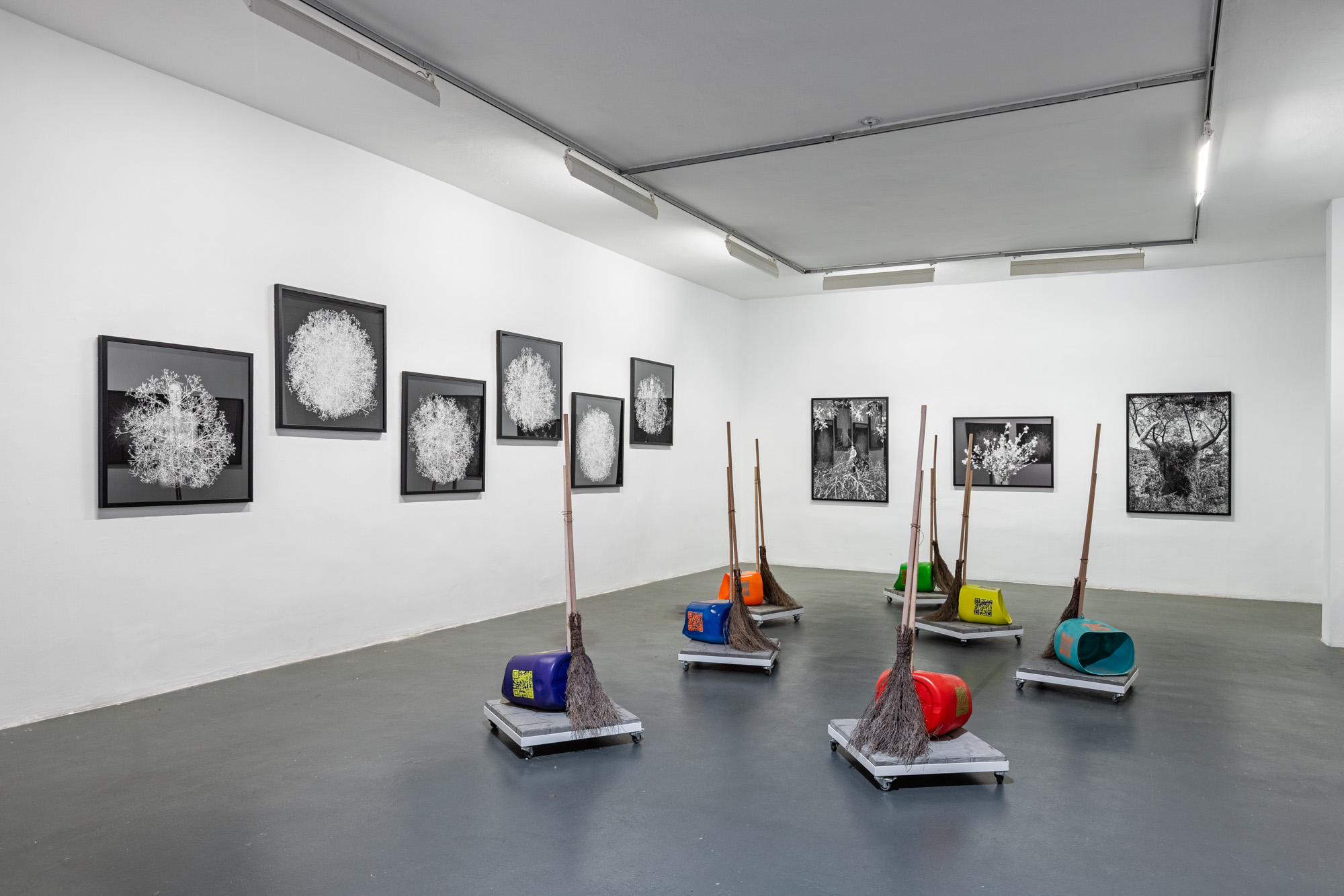 Presented alongside new works from the "Off White" series, the installation "How Do You Exist? How Do You Make Your Own Broom? How Do You Disappear?" draws inspiration from a common and often overlooked object in public spaces—an object made of plastic containers, wooden sticks, and twigs, inherently open to change and recycling. The phrase "How do you make your own broom?" poses the question of how we can develop our own alternative worlds and forms of resistance through small gestures or tactical thinking, and how we might create spaces to breathe.