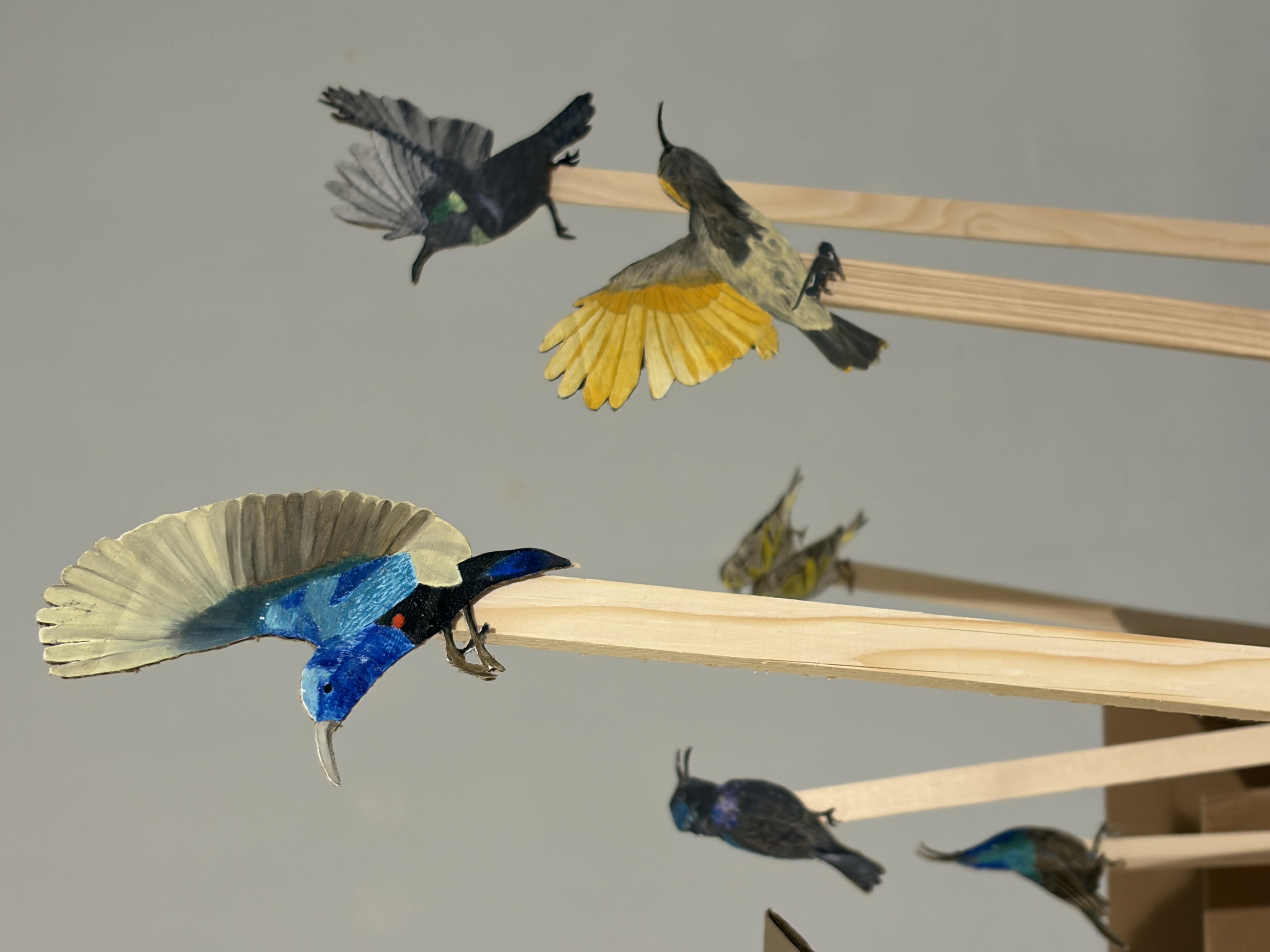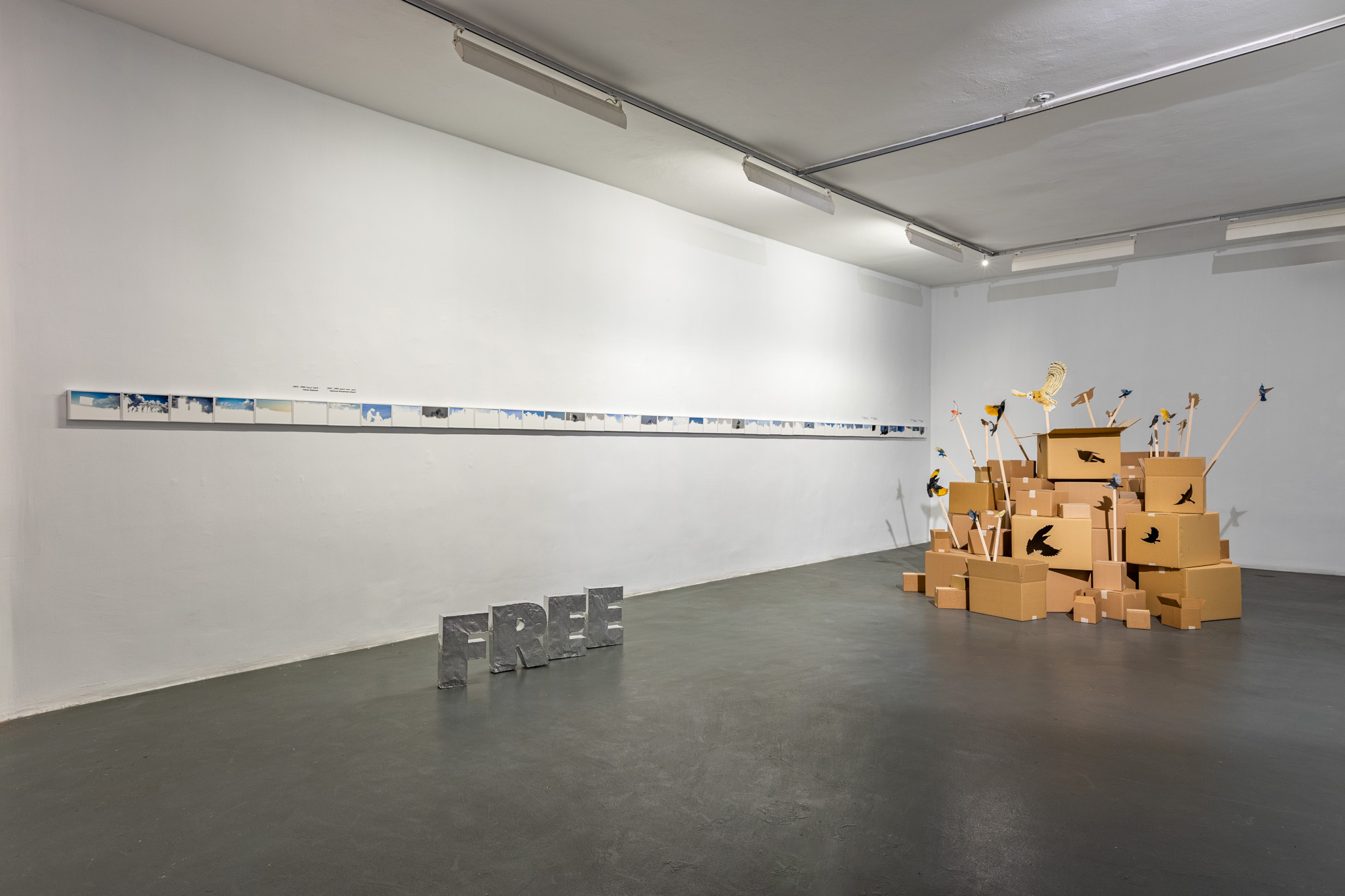 Sergi, sanatçının gökyüzüyle kurduğu çok katmanlı ilişkiye odaklanan yeni eserleri ile mekana özel olarak ürettiği enstalasyonunu bir araya getiriyor. “Son Gökyüzünden Sonra Nereye Uçmalı Kuşlar?” enstalasyonu ismini şair Mahmoud Darwish’in dizelerinden alıyor ve Filistin’e endemik olan kuşları konu ediyor. Enstalasyon Serra Tansel’in Londra’daki Filistin Dayanışma Yürüyüşü’nde gördüğü karton bir kuşun yarattığı imgesel kırılmadan ilham alıyor. Hareket, özgürlük ve barışın simgesi olan kuş, küresel lojistik ağlarının gündelik malzemesi olan karton kutularla birleşerek, ticaret nesnelerinin akışkanlığı ile zorunlu göçe ya da hareketsizliğe mahkum edilen bedenler arasındaki çelişkiyi görünür kılıyor.
