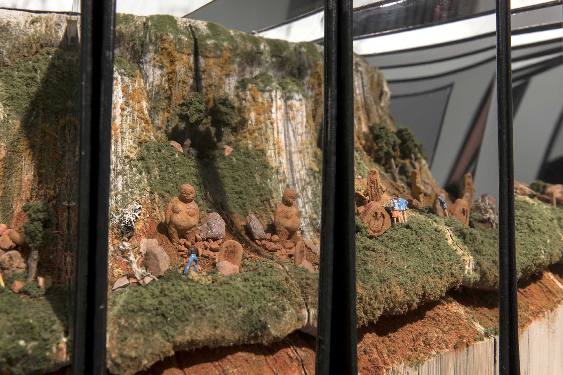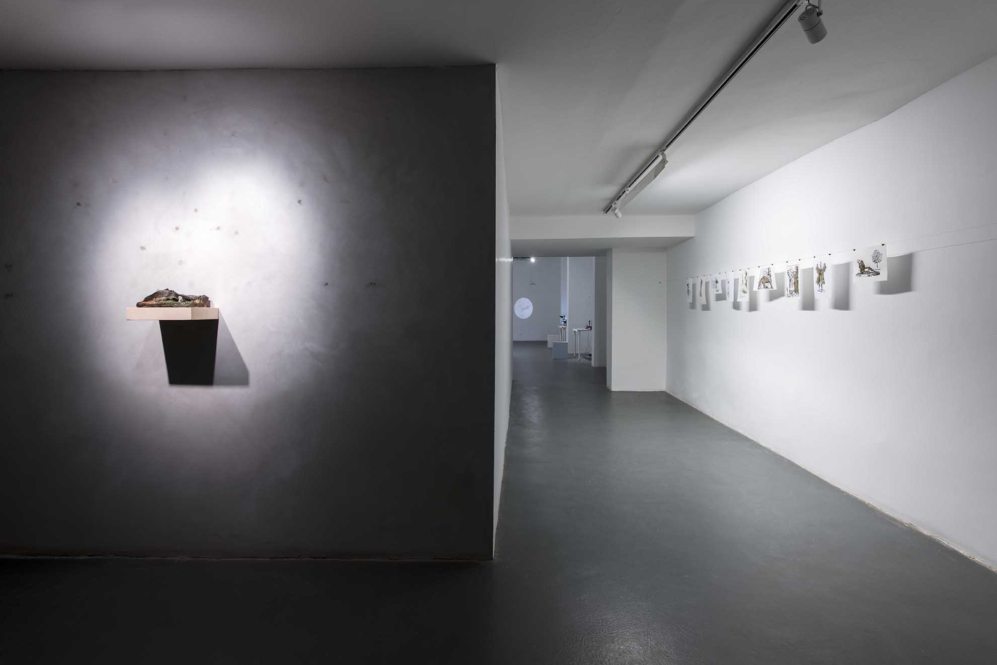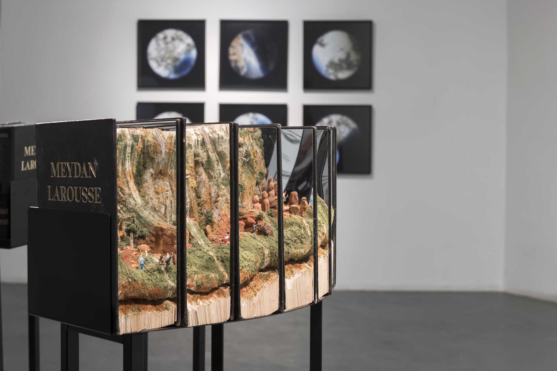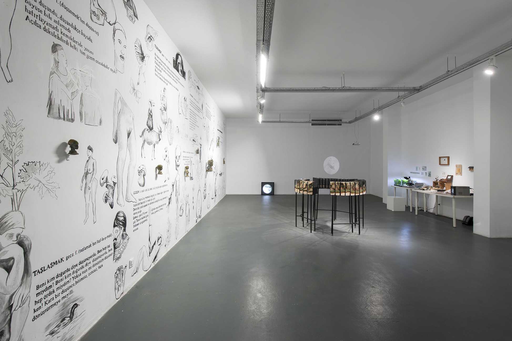 The encyclopedias are the most iconic representations of the Enlightenment. They contain systematic information and visuals representing science, arts and crafts. Artist rejects precise and clear information by eroding, erasing, cutting and cutting encyclopedias and offers a “close-up”, an image where life itself is sensed rather than a modern thinking that wants to govern nature. While the intense presence of encyclopedias implies the weight of the constructed knowledge, the tiny figures draw near and urge the viewer to create a subjective narrative. As Bachelard said; “One has to go beyond logic to experience what is small and what is big.” (1994: 150). This idea spreads to the entire exhibition. The installation “Erased Poetry Notebook” gives the audience a chance to navigate through Tok's sketchbook. Artist, who takes the encyclopedic contents out of their contexts, re-classifies them and blends them with his own interpretations, carries her notebook to the walls of the gallery.