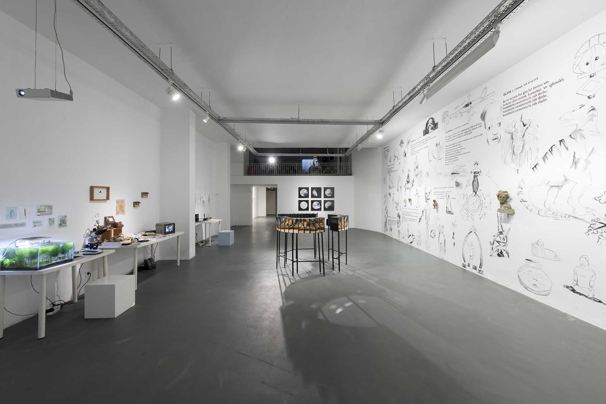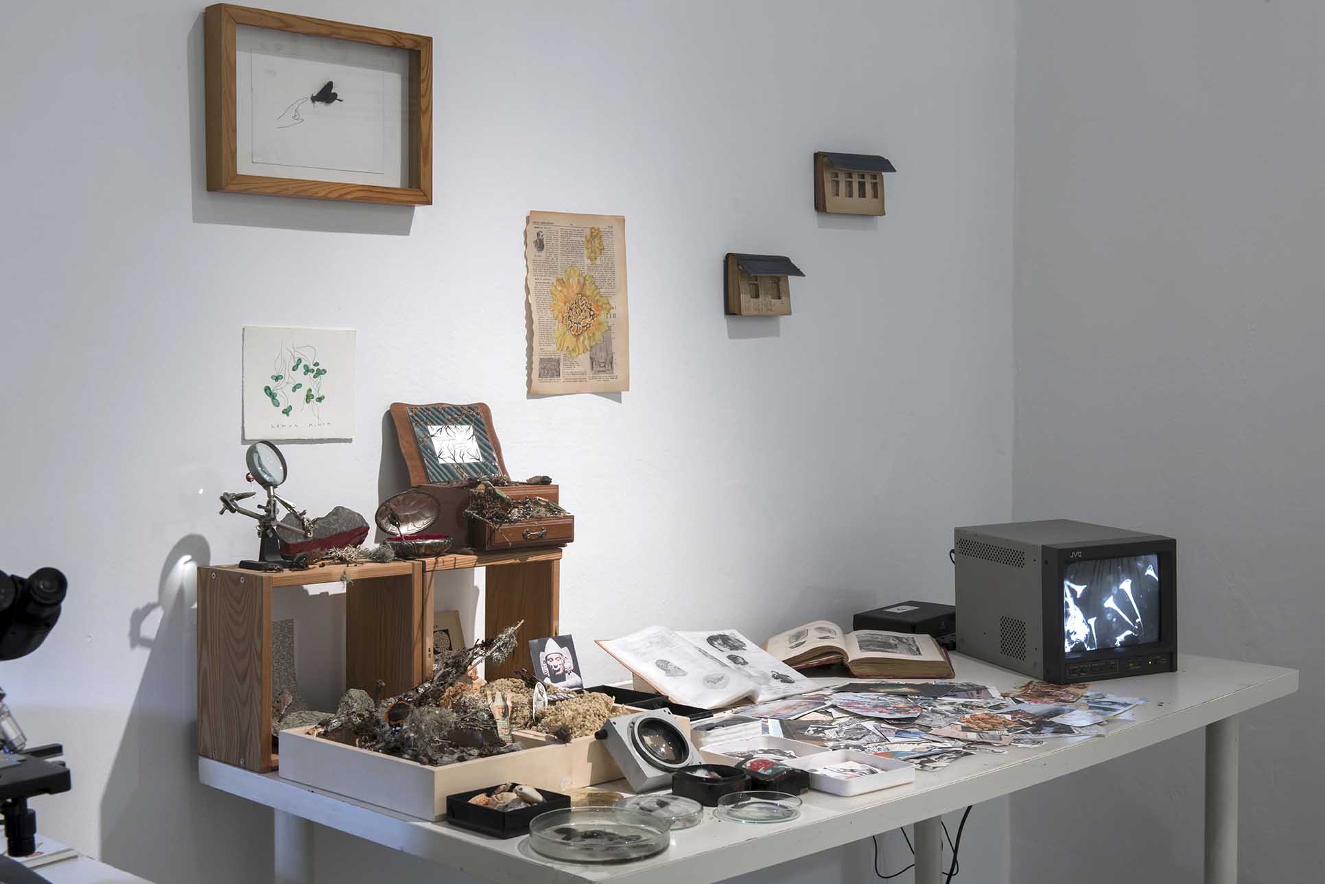 Irem Tok’s production process includes research, interpretation, discovery, exploration, collection, accumulation, thinking, taking notes, drawing and merging. İrem Tok's studio, which resembles to a laboratory, where she conducts experiments and, is transported to the gallery; microscope, robot arm, aquarium, plants that turned into a research object and the blustered letters meet the audience for the first time.