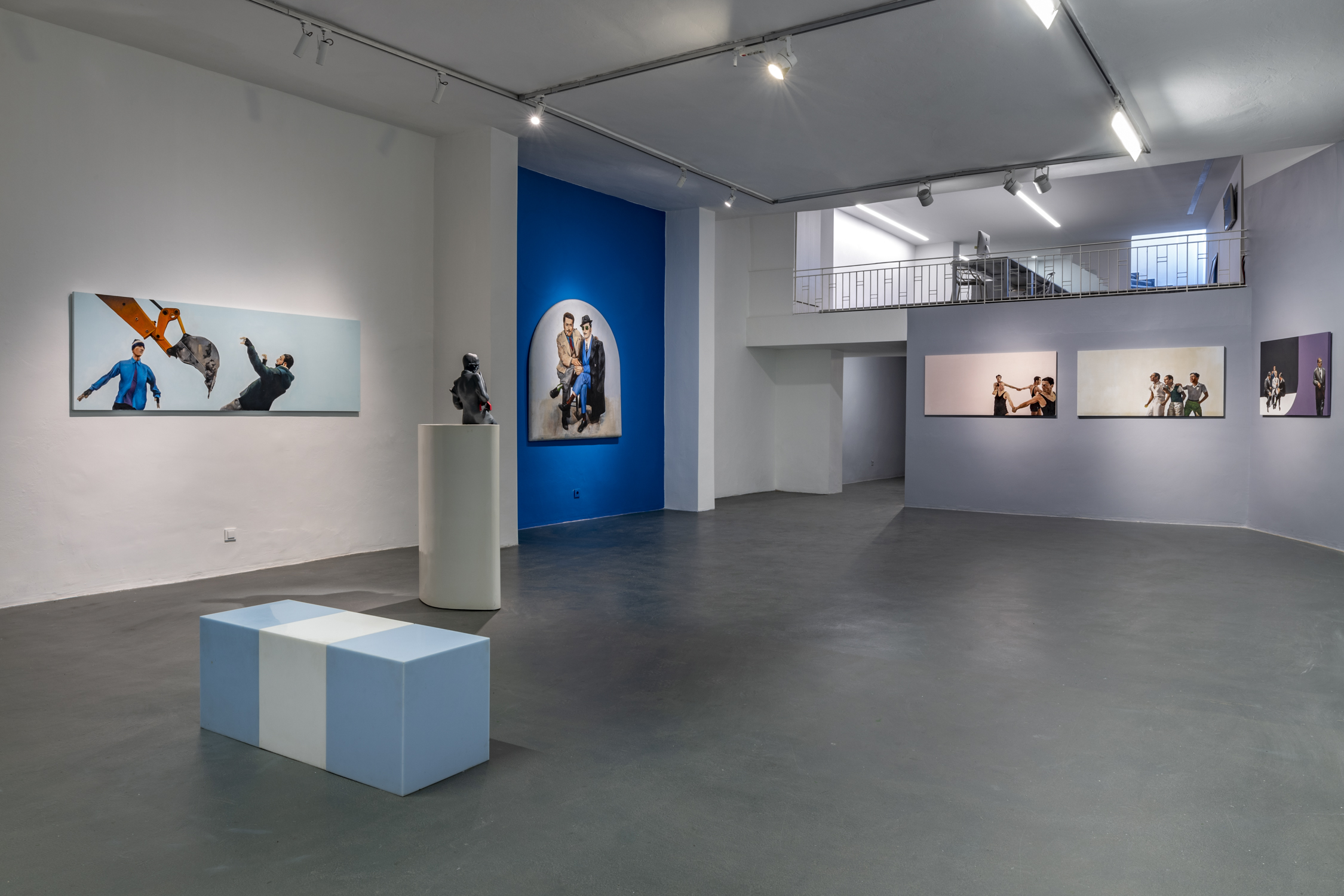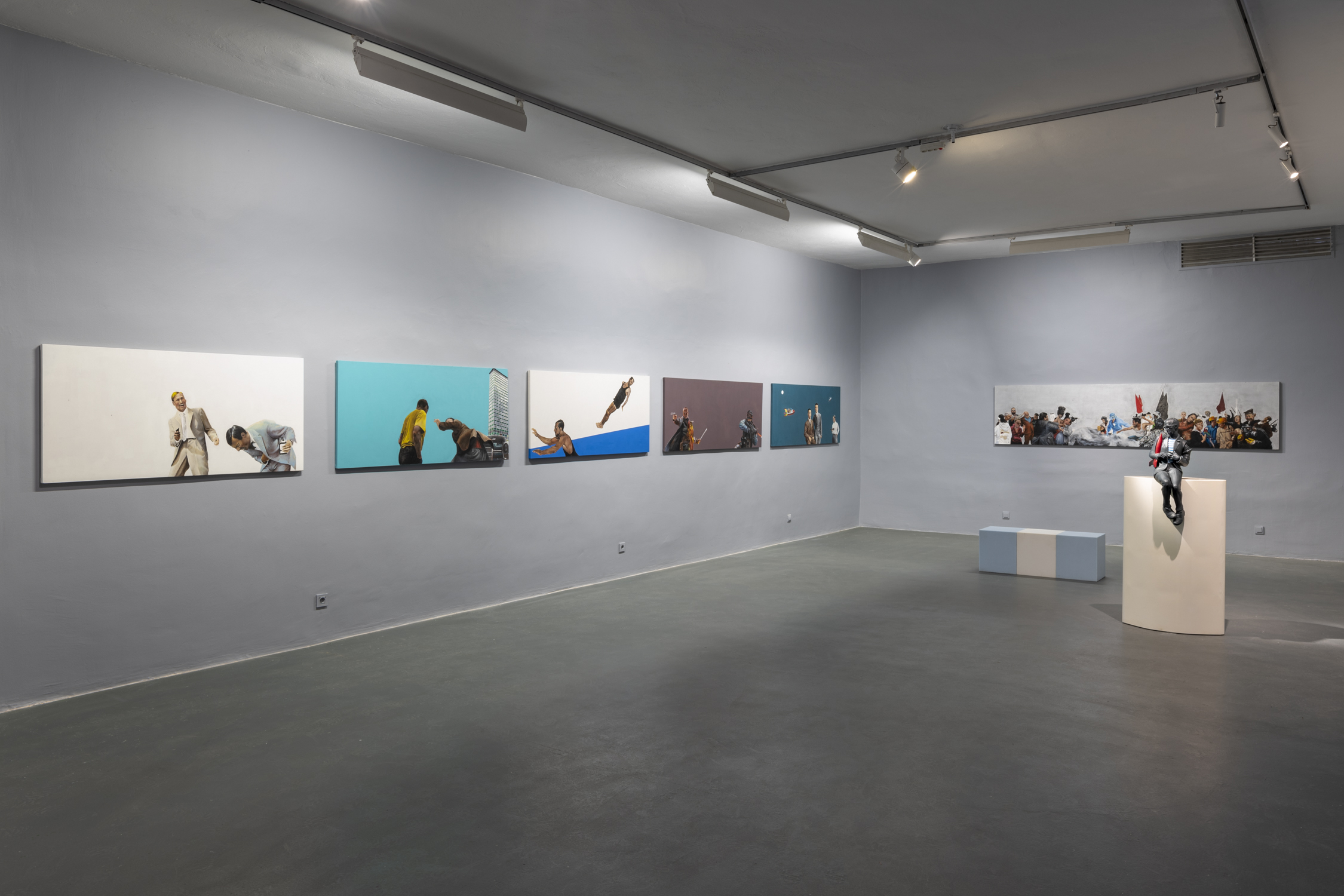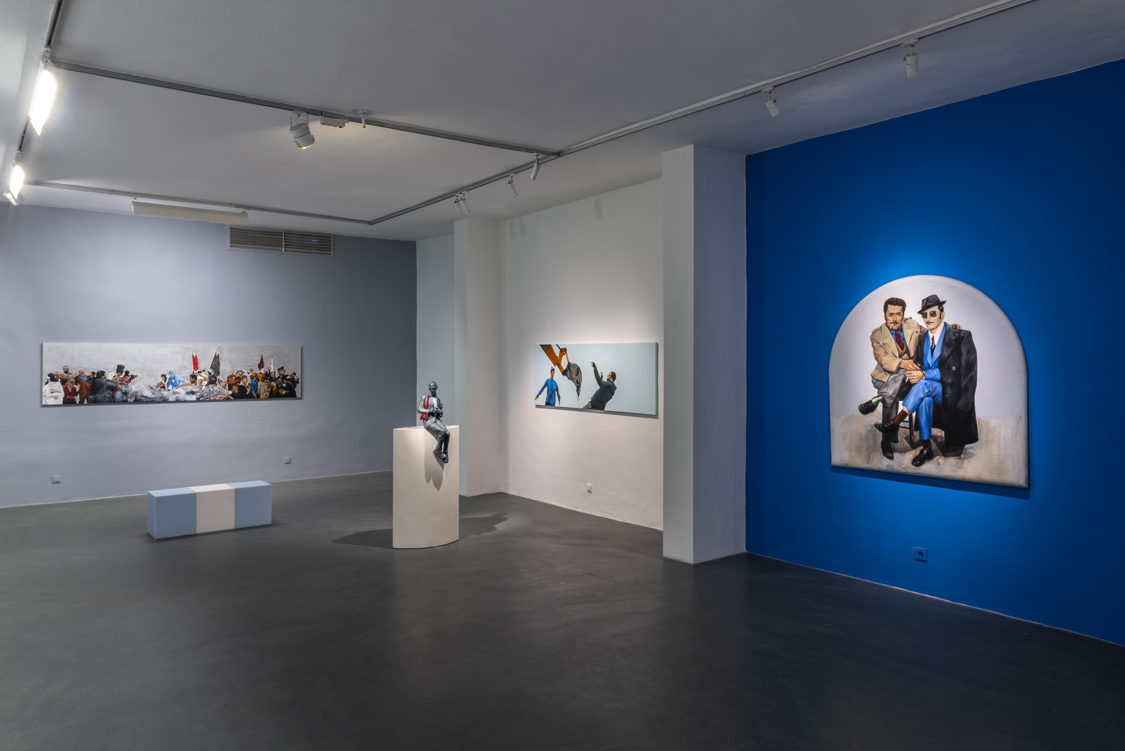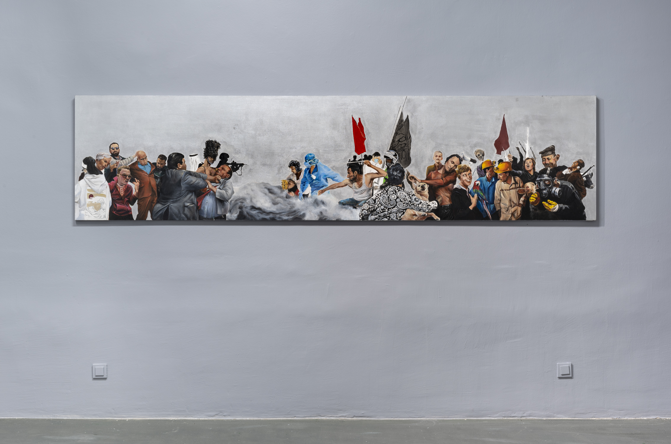 Paintings float in space without gravity; both time and space are erased from the background. These are subtracted images just waiting to be identified through bodies, faces, and gestures. Their noise has been erased, their excesses have been removed, they have remained bare. Now -and thus- it has become possible to connect all these references, to read the engineers and ordinary violence in photo novels side by side. In the world of Şahinler, the good, the bad, the goons and the geniuses are lined up like a chessboard. However, the roles can change, transform into one another. The moment all these paintings are crystallized is the work called “The principle of moments”, in which more than 30 characters come together. It is as if we are witnessing a show; yellow vests, miners, proletarians, power figures; Christine Lagarde, oil-rich Arabs, fashion designers, bankers… In the middle, there are the anti-monarchists who are stuck between these two groups, and the healthcare workers who are fighting heroically during the pandemic process. These paintings, sometimes noisy and sometimes silent, present a multidimensional, extremely personal and yet general panorama of our time.