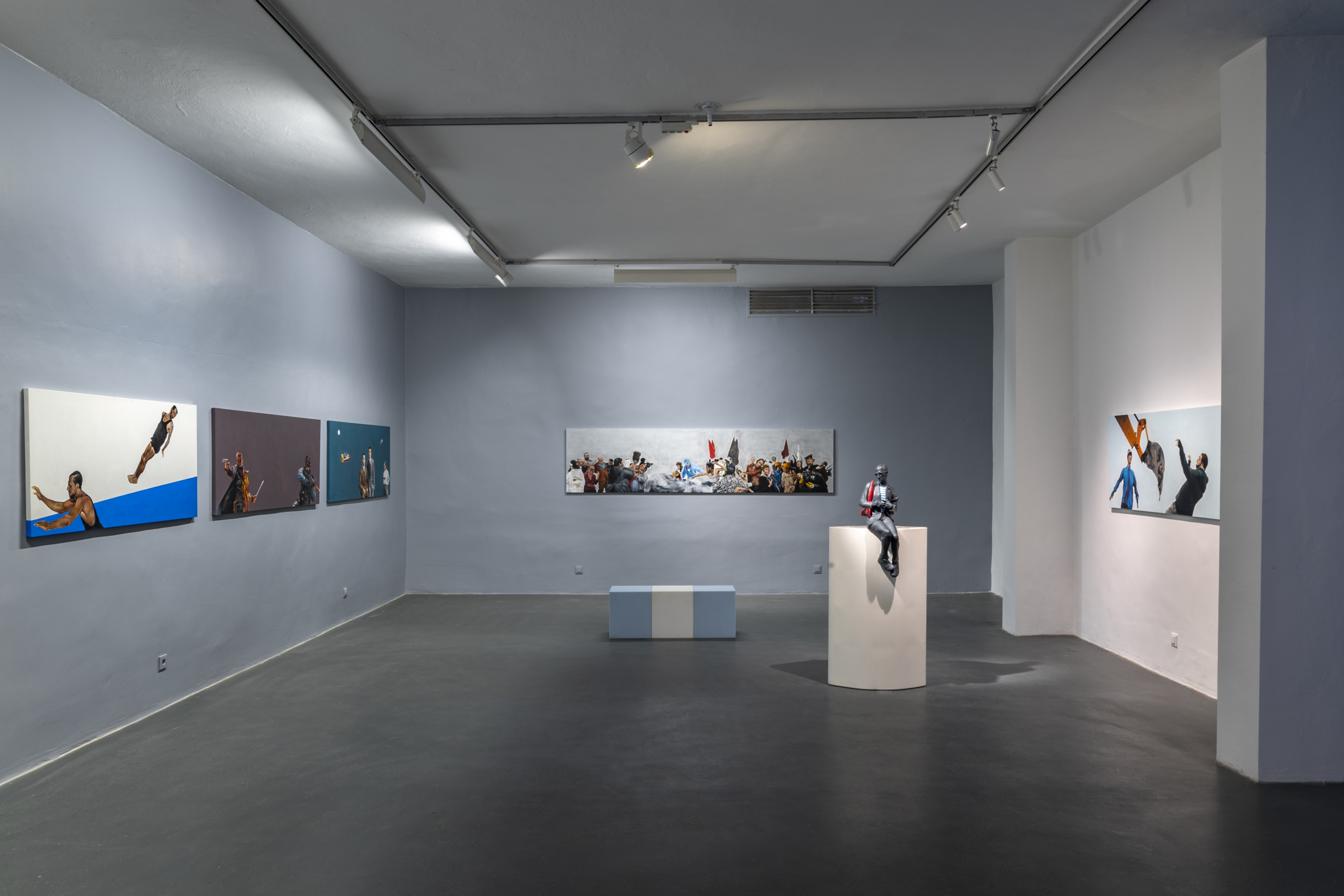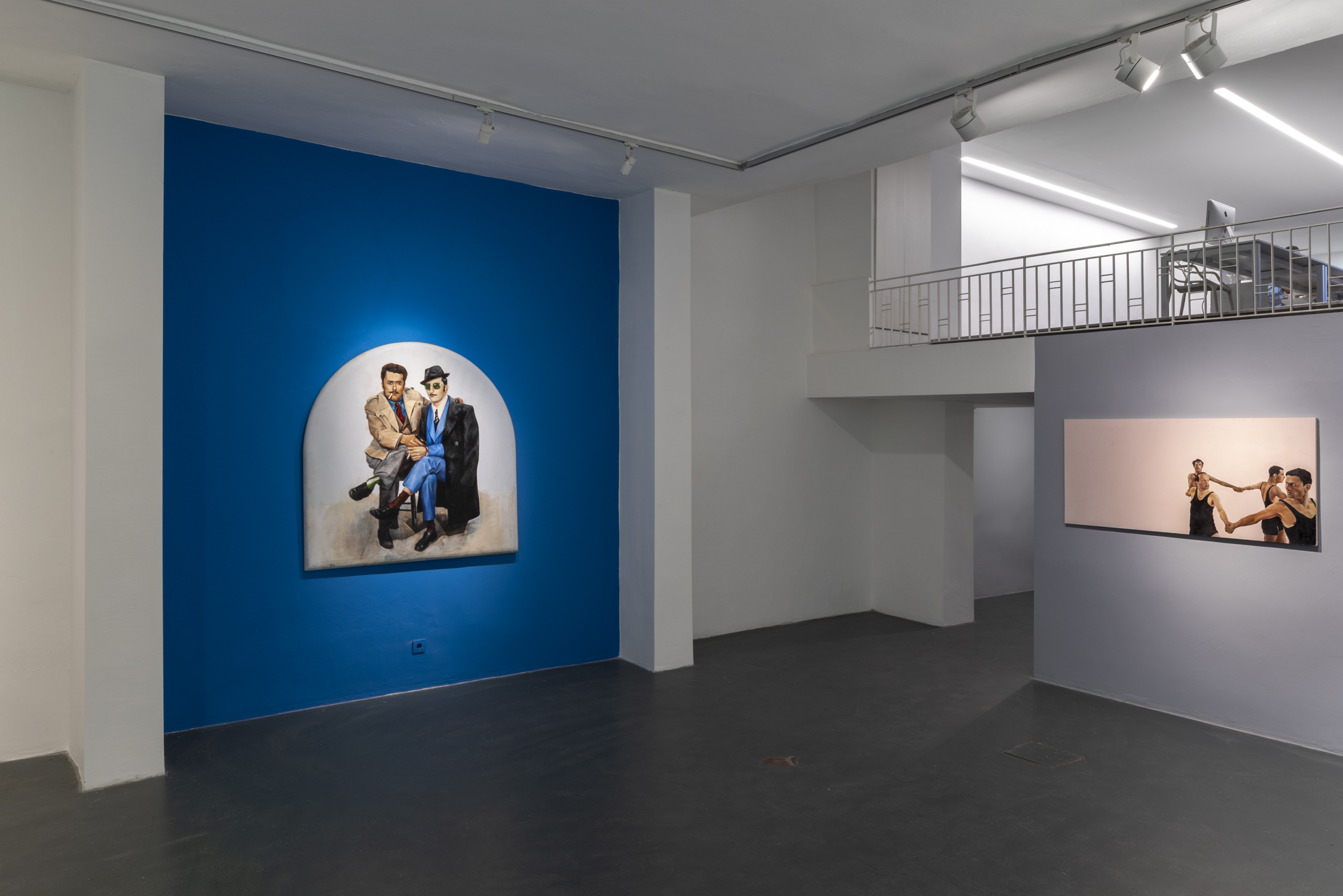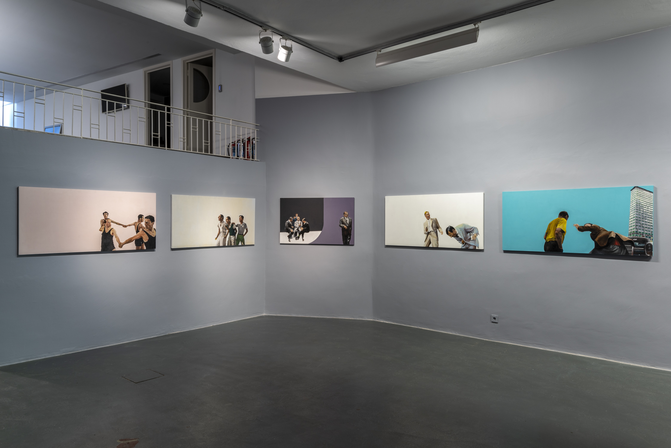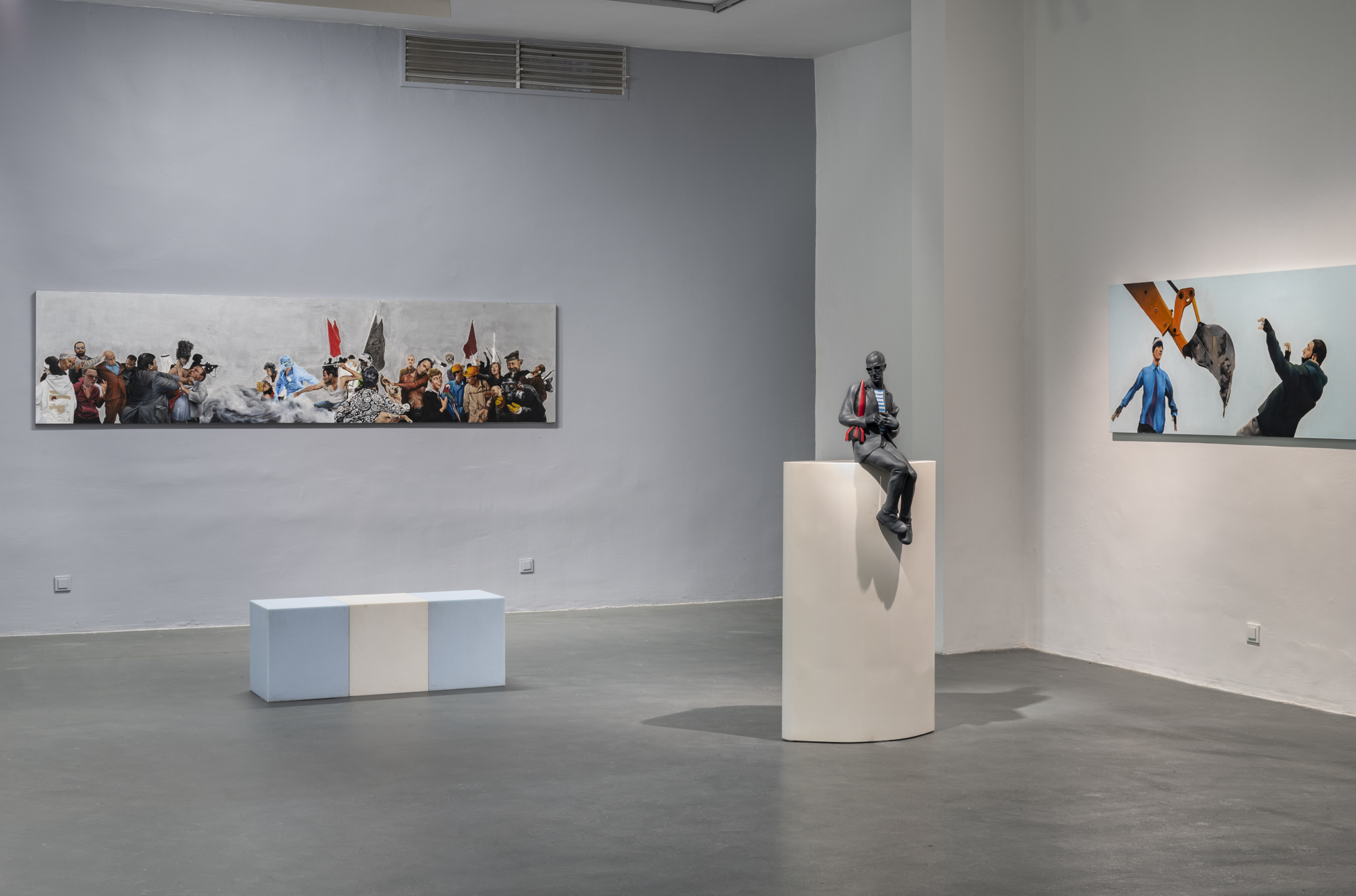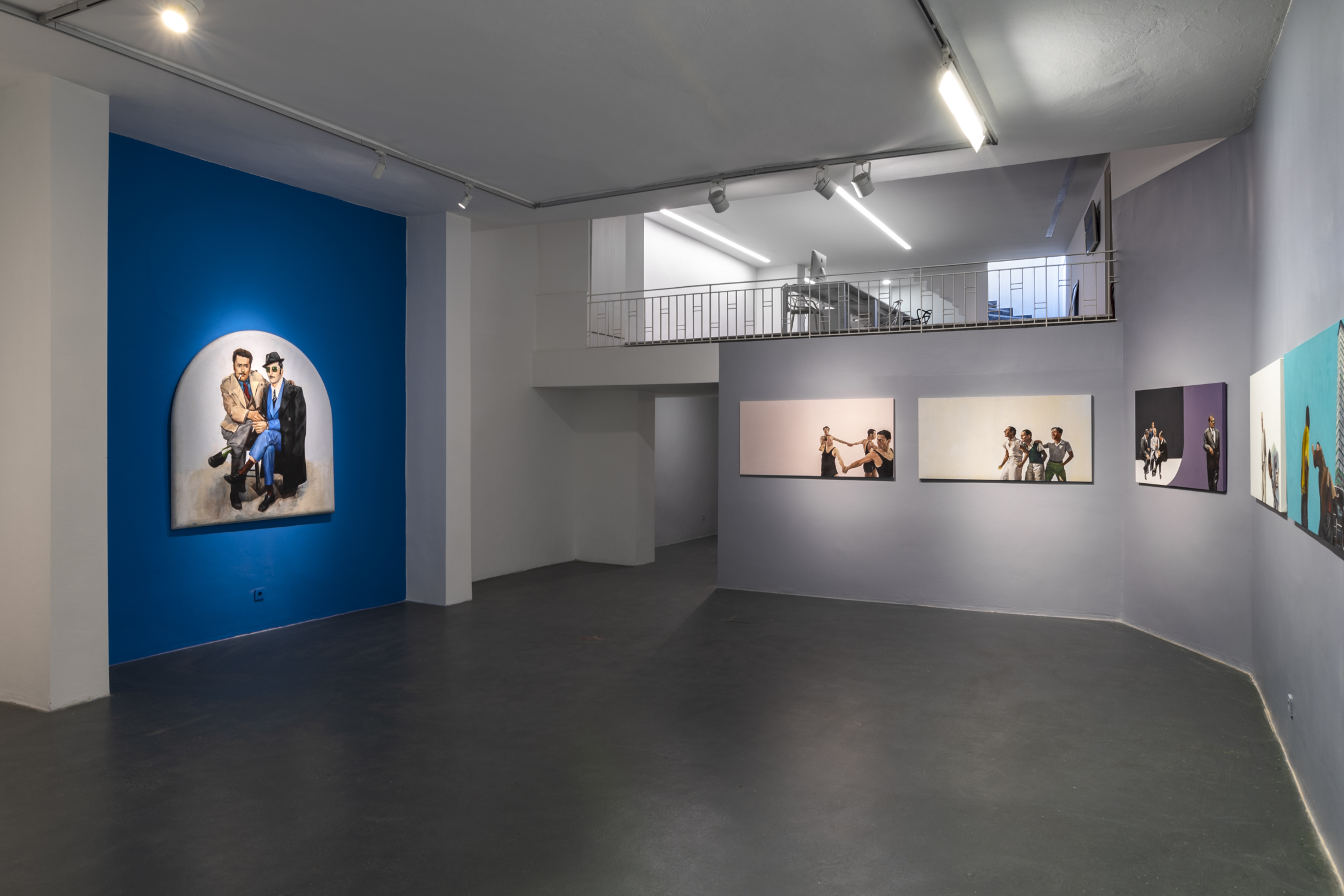 Paintings float in space without gravity; both time and space are erased from the background. These are subtracted images just waiting to be identified through bodies, faces, and gestures. Their noise has been erased, their excesses have been removed, they have remained bare. Now -and thus- it has become possible to connect all these references, to read the engineers and ordinary violence in photo novels side by side. In the world of Şahinler, the good, the bad, the goons and the geniuses are lined up like a chessboard. However, the roles can change, transform into one another. The moment all these paintings are crystallized is the work called “The principle of moments”, in which more than 30 characters come together. It is as if we are witnessing a show; yellow vests, miners, proletarians, power figures; Christine Lagarde, oil-rich Arabs, fashion designers, bankers… In the middle, there are the anti-monarchists who are stuck between these two groups, and the healthcare workers who are fighting heroically during the pandemic process. These paintings, sometimes noisy and sometimes silent, present a multidimensional, extremely personal and yet general panorama of our time.