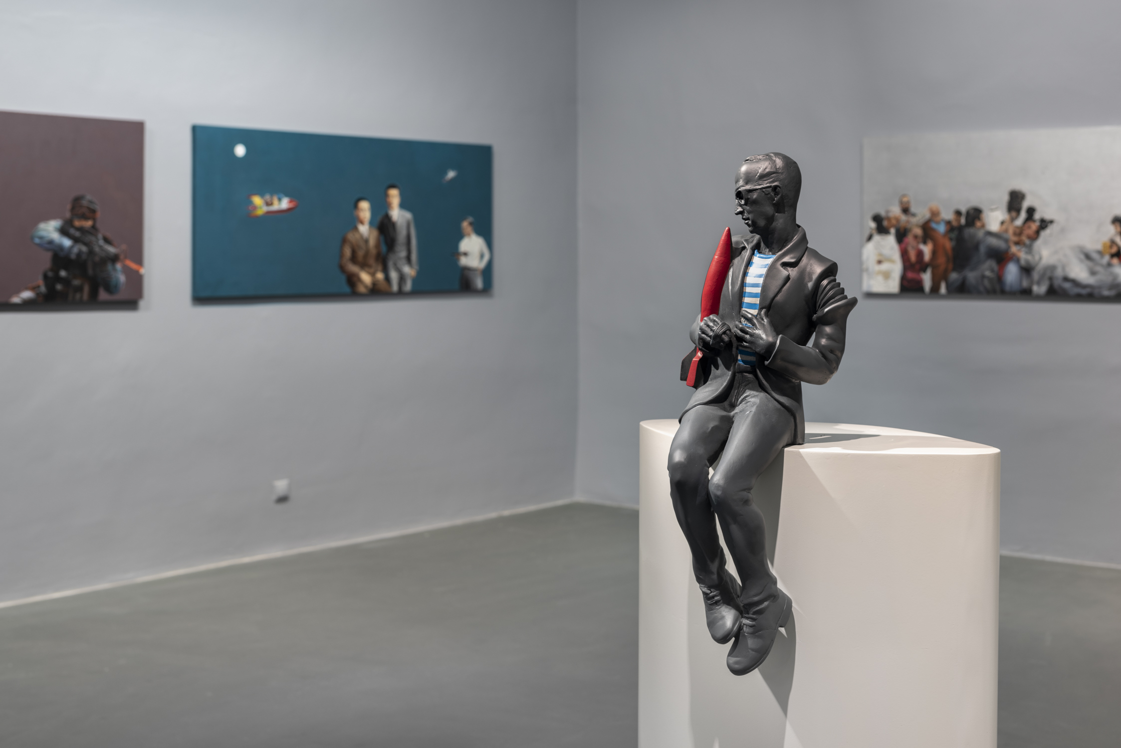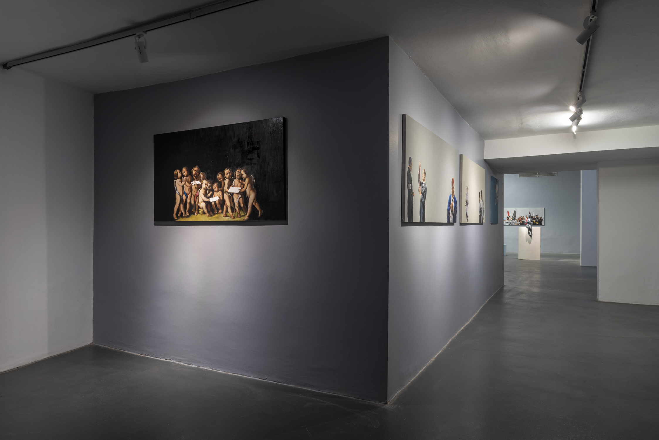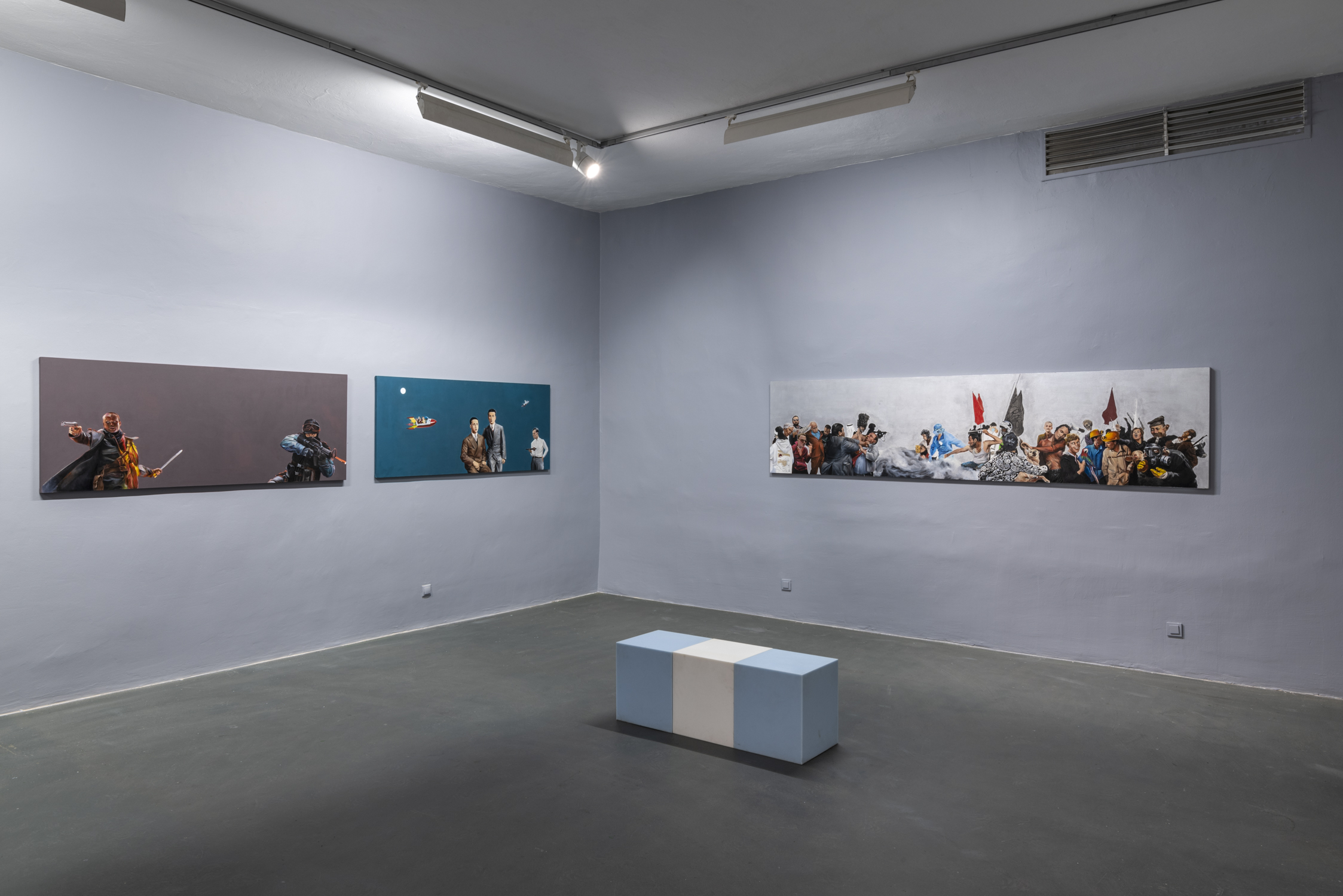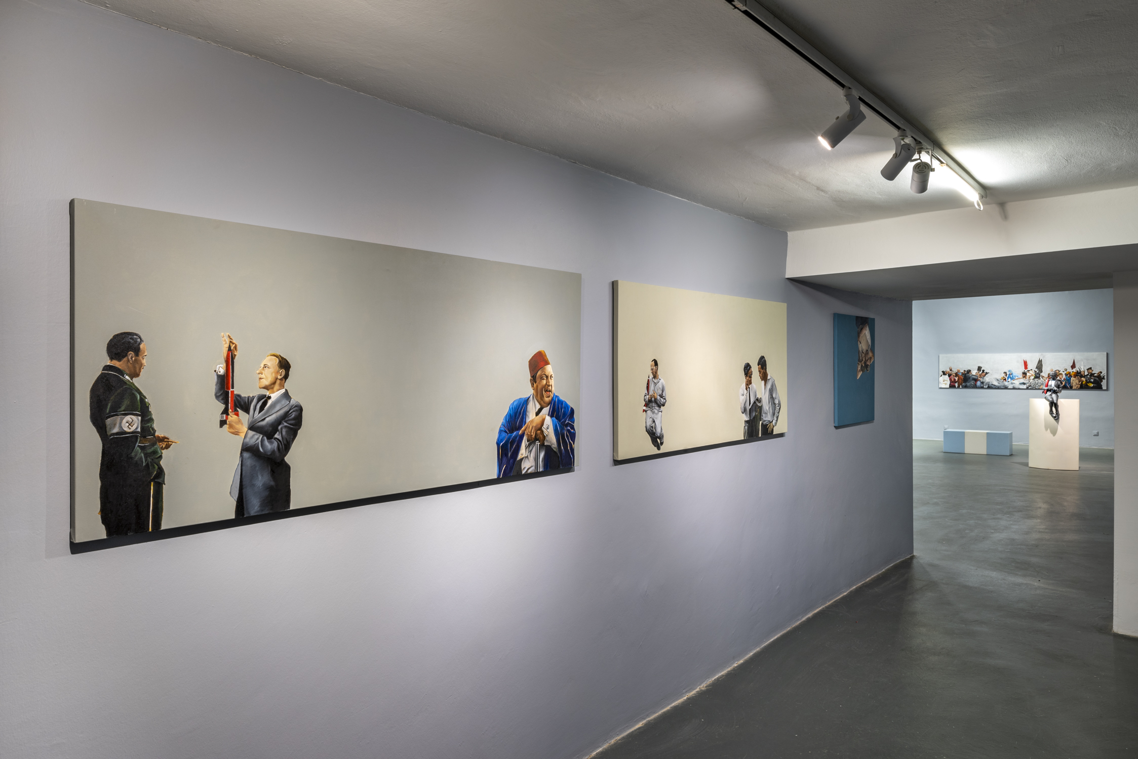 As in miniature paintings, two-dimensional, shadowless characters are the most fundamental commonality in his new paintings. Each of them is drawn at the same height with us, hung right in front of us and we only see the figures from the waist up. As if Şahinler says: “It is these ideal bodies that will establish the ideal society envisioned by the modern world”. Yet, we see that whatever the rational/modern mind idealizes is slowly decaying. Everything is undermined in these pictures. Science produces rockets/missiles, the desire for the ideal body, Hitler invokes fascism. The world of ideals seems to have come to an end; We are now in another age where wars and social tensions are on the rise. We're looking at a murder scene which rings with laughter.