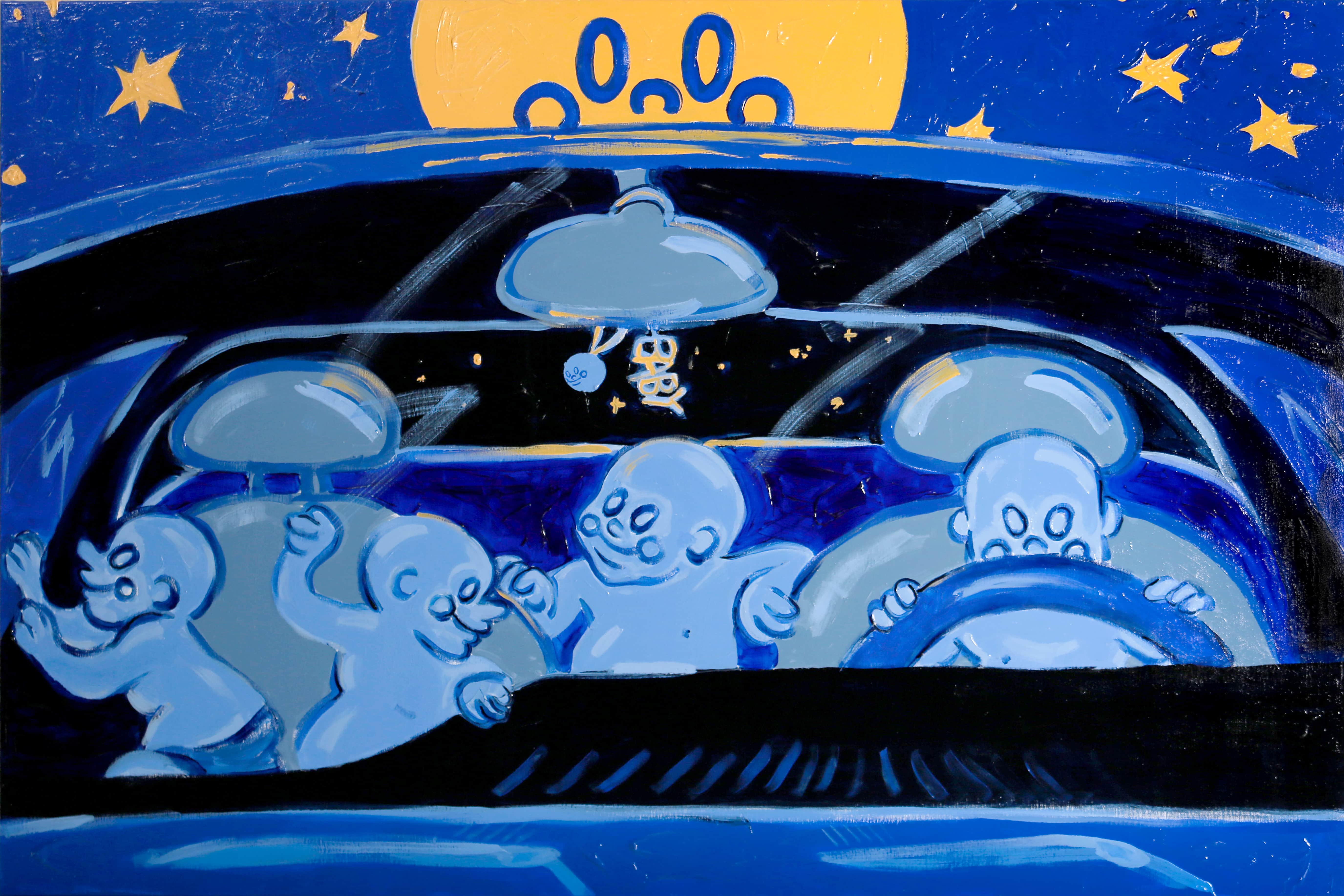 "Baby on Board" (2023) explores adulthood and living in today's fast-paced society. Beyond the painting, the artist conveys the immaturity many feel in this continuously ever-changing environment. While Çebi's characters deal with the burdens and the responsibilities that life throws at them, they appear to be blissfully ignorant of what they are doing at one point. In a world where "adults" are at the wheel and direct their lives, seemingly having complete control over their lives, these characters, unconscious of the facts, give the appearance that a baby is in the driver's seat.
