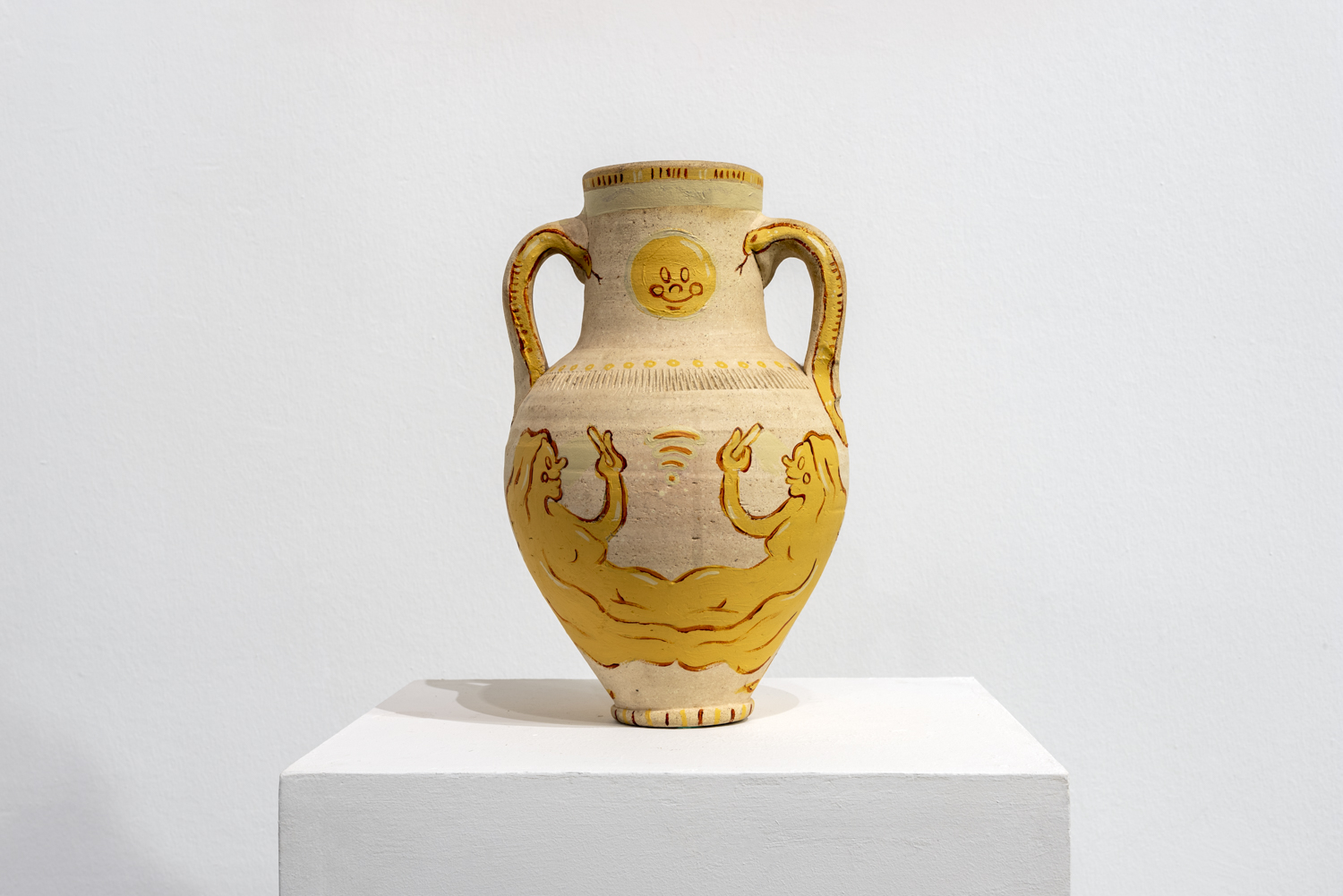 Pilot Gallery is happy to announce to host Melih Çebi's first solo exhibition at its gallery space, titled "Baby on Board", between March 18 and April 22, 2023. "Baby on Board" presents Melih Çebi's personal journey to connect with other creatures and the world around him, the everlasting search for the identity of the individual who was born into a consumer society and tries to keep up with the digital age, with works produced over the last four years. By juxtaposing personal and historical, past and contemporary issues interweave into a tapestry of references. Çebi offers a consistent language throughout his works spawned over different mediums such as sculptures, carpets, paintings and ceramics, which are home to a familiar character cader.