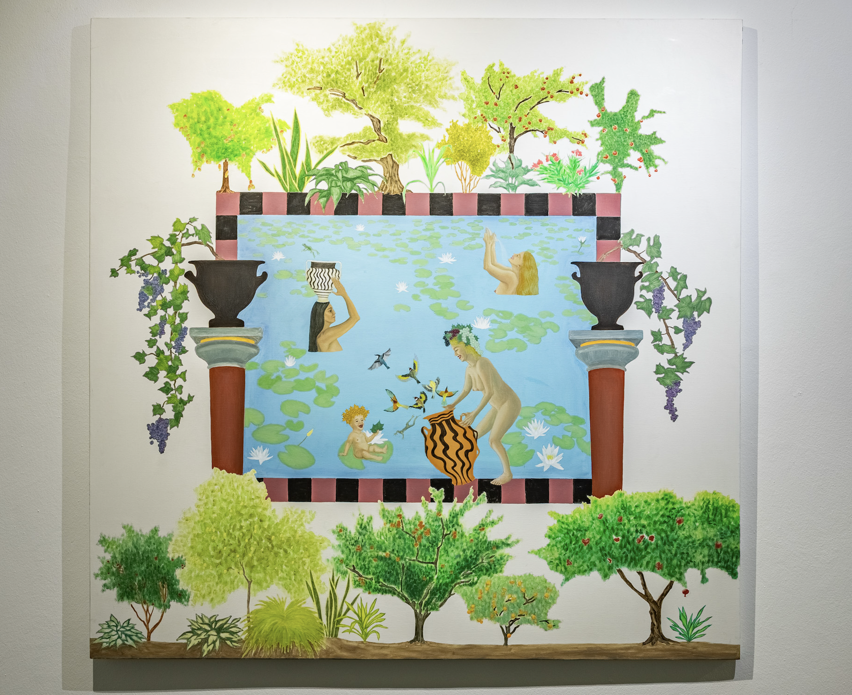 The 'gardens' at the heart of the exhibition function as metaphors: they symbolize a life cycle adorned with ruins and diversity. The artist draws parallels between geographies devastated by war and shaken by past uncertainties, and the political, social, and ecological turmoil of today. In these new paintings, Erkaya emphasizes the power of geography in shape human consciousness, while also addressing the 'fantastic' and 'fictional' aspects of history with a sarcastic tone. 'The Snake Charmer’s Garden' narrates the history of storytelling through a series of paintings that highlight the constructed nature of rituals, mythology, and capital-H History. The Ottoman evenings, where candles were carried on the backs of turtles, intersect with the sunlit gardens of Bastet, the feline goddess of Egypt.