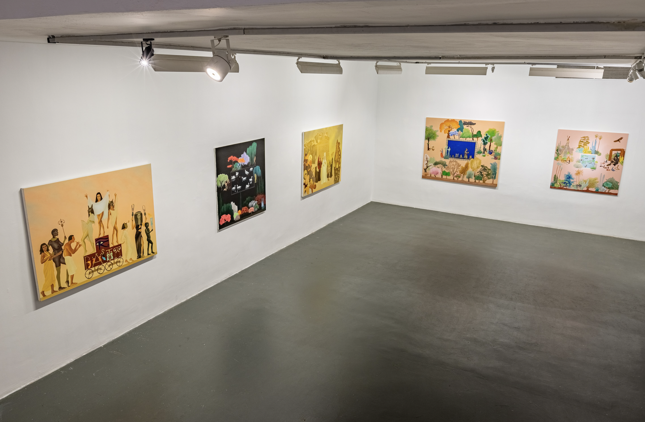 Erkaya’s recent works present a fantastical panorama of a world populated by animal-like humans and human-like animals, dancing figures, garden landscapes, and boundless vegetation—sometimes submerged, sometimes burning. Influenced by the tradition of miniature painting, botanical illustrators, the music of Jan Garbarek, and the vision of contemporary poets and writers like Lale Müldür, these compositions reinterpret a vast historical stratum—from Ancient Egypt to Mesopotamia, from shamanism to the tradition of the meddah—through a contemporary language.