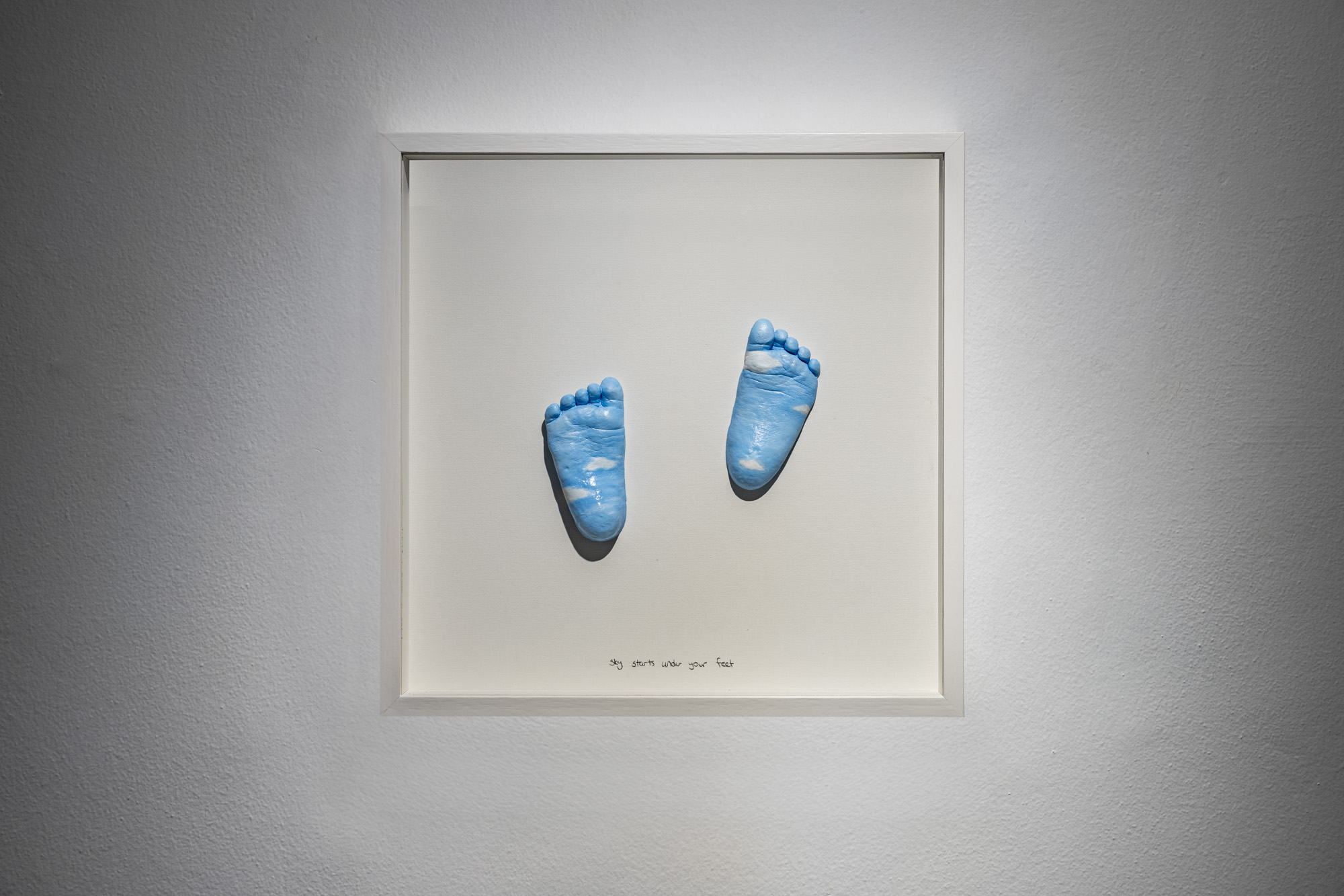 The artist’s gaze, turned towards the sky during the first months of motherhood, focuses on how this space, laden with transcendence, hope, and mythological promise, has been redefined by death, loss, and absence in the era of wars we are living through. The place of the sky in cross cultural memory stars as refuge, the horizon as a projection of the future, intertwines with experiences of personal grief, birth, and collective trauma to form a new narrative. Tansel’s plaster sculpture, cast from her baby’s footprints and painted to resemble the sky, offers a poetic intervention into spatial perception. These small feet, which invert the idea that the sky begins where the earth ends, bring the distant heavens shaped by imagination, belief, and mythology closer through the materiality of the body, prompting us to rethink the sky as an accessible space.