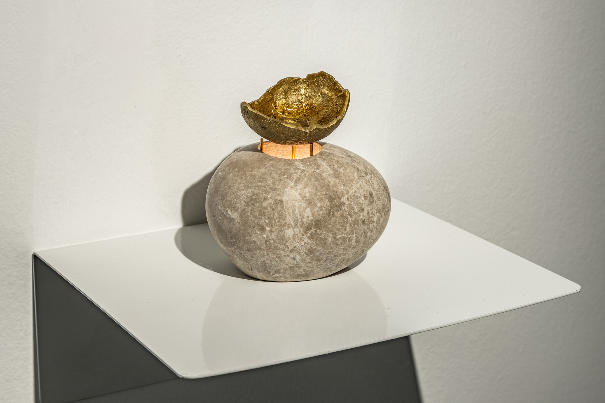 Tansel’s works that engage with scent, surface, and memory translate the relationship between body and environment into a sensory register. An oil burner cast from orange peel, produced in reference to Palestine’s orange groves - which created the biggest orange supplies to the world between mid-19th to the mid-20th centuries - carries the intimate fragrance of displacement and the idea of home; while the limestone plinth invites the memory of geography into the space. This sensory intensity leads the viewer on a simultaneous journey toward contemplating a distant geography and their own inner world.