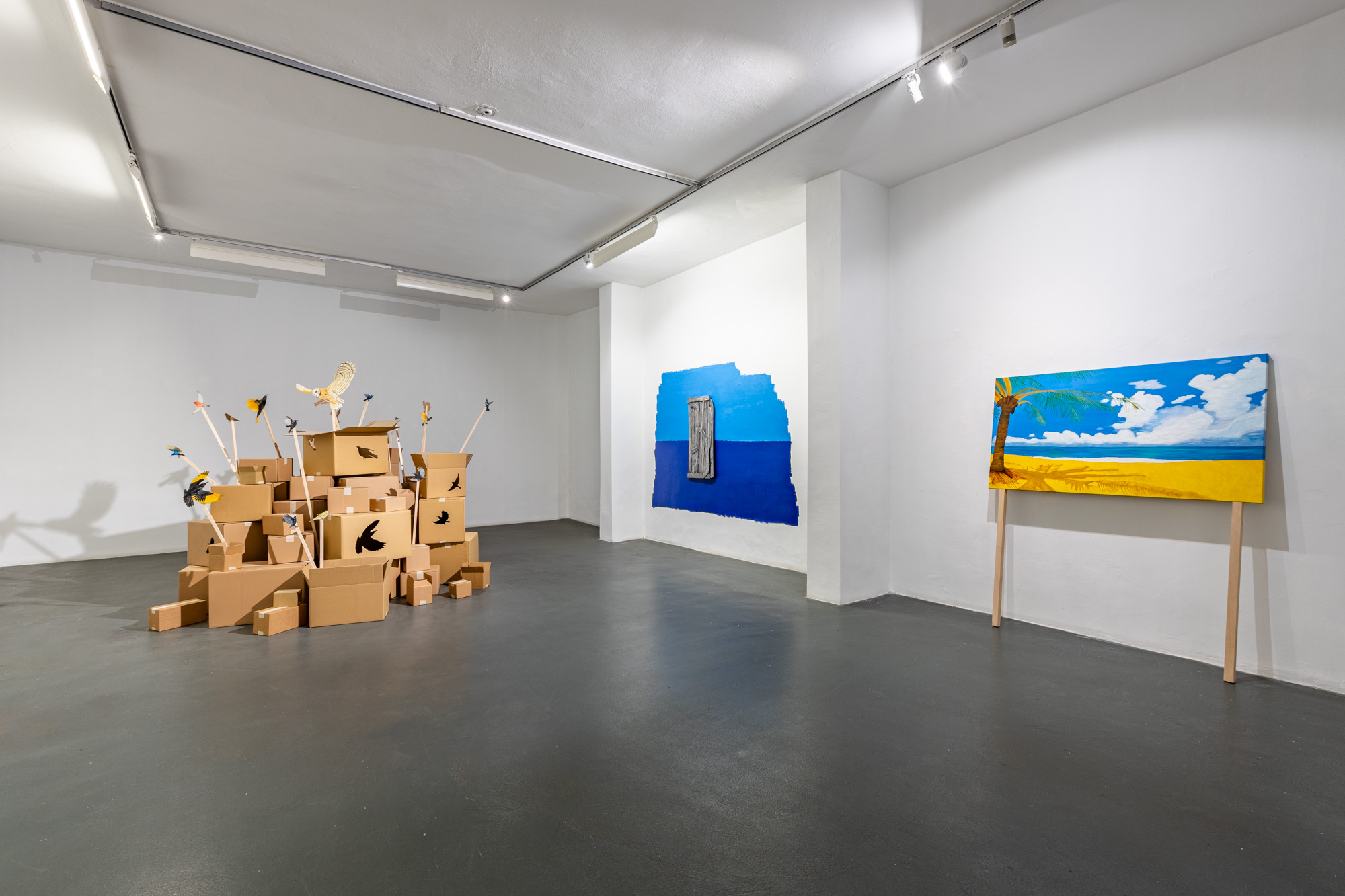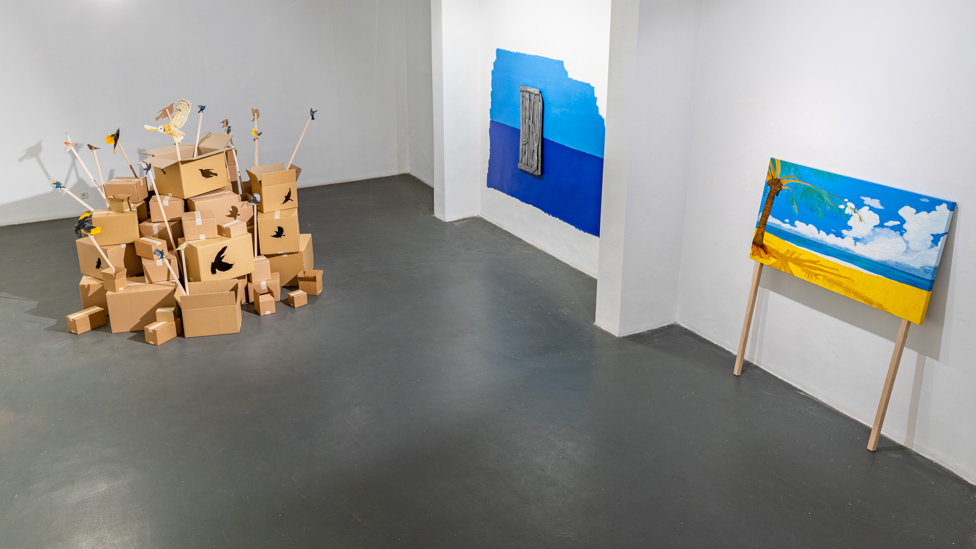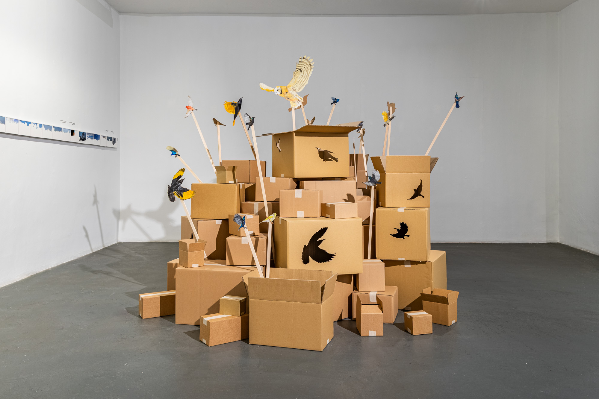 The exhibition brings together the artist's new works, which focus on her multi-layered relationship with the sky, as well as her site-specific installation. The installation takes its name from poet Mahmoud Darwish's lines “Where Do the Birds Fly After the Last Sky?” and features birds that are near-endemic to Palestine. The installation, titled Where Do the Birds Fly After the Last Sky? is inspired by the imagery of a cardboard bird Serra Tansel encountered at the Palestine Solidarity March in London. The bird, a symbol of movement, freedom, and peace, combined with cardboard boxes, the everyday material of global logistics networks, reveals the contradiction between the fluidity of trade objects and bodies condemned to forced migration or immobility.