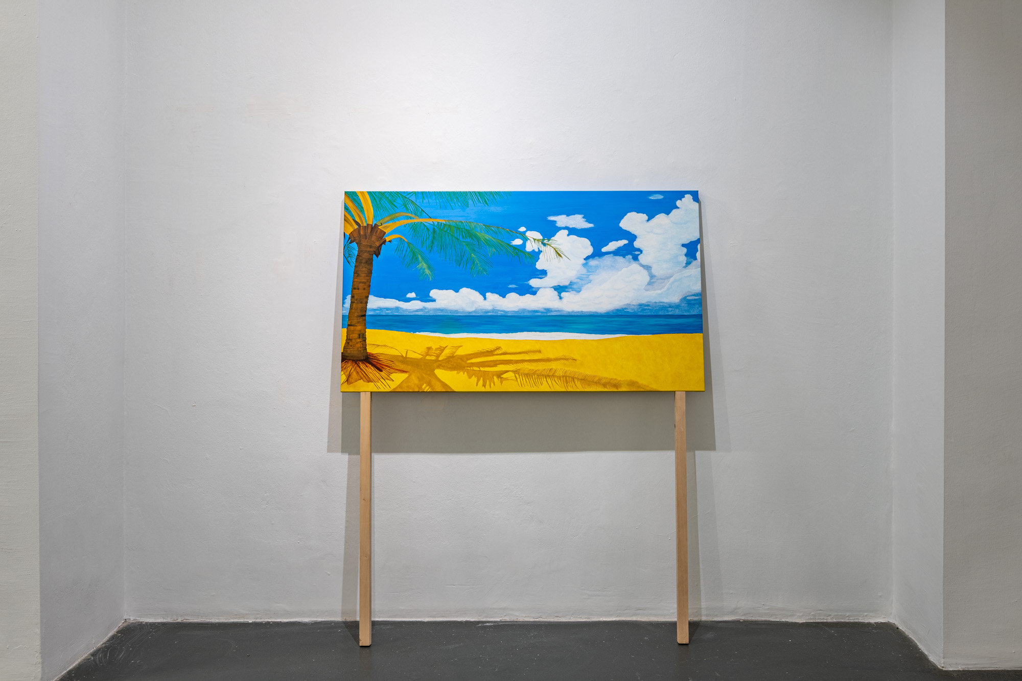 FREE-range transforms the political connotations of language into a spatial play through remotely controlled, chicken-sized letter mechanisms. While the sky is imagined as a zone of escape, Puerto Rico offers another kind of false refuge: an oil-painted reproduction of a Puerto Rican beach poster hung in the open visitation areas of a prison reinterprets images of controlled freedom. The brightness of the exotic landscape holds both the promise of freedom and its unattainability.