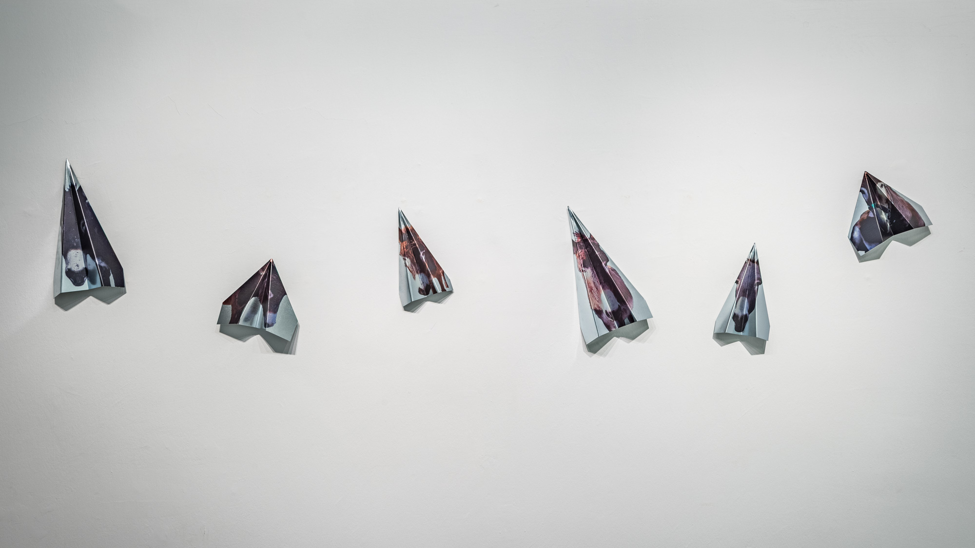The trace left in the sky by political violence turns into searing satire in another work: The Donkey Flight Project. With Gaza’s roads destroyed, donkeys that became rescue vehicles are seized by the IDF and transported to Europe under the name of an “animal rescue operation,” addressing the contradictions of destruction and the absurdity of its representations. Donkey portraits hung on galvanized metal sheets folded into origami planes reveal the tension between flight and captivity, compassion and exploitation, prompting viewers to question how the political meanings of the sky are reproduced.