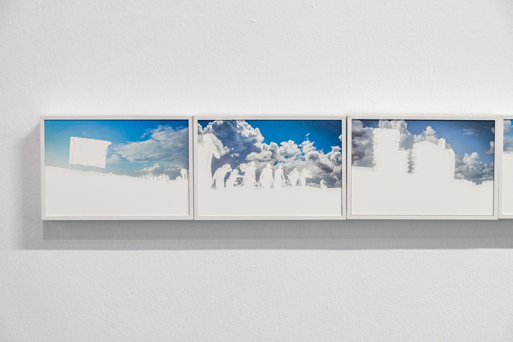 The exhibition’s sky-centered conceptual framework further expands with other works that bear traces of invisible violence. The photographic series Under the Same Sky preserves only the sky portions of images taken by Gazan journalists whose lives were cut short, making visible the silence of the destroyed lives and images, as well as the dual burden created by censorship. When placed side by side, these skies create a topography that holds both the void of a lost world and the resilience of imagination.