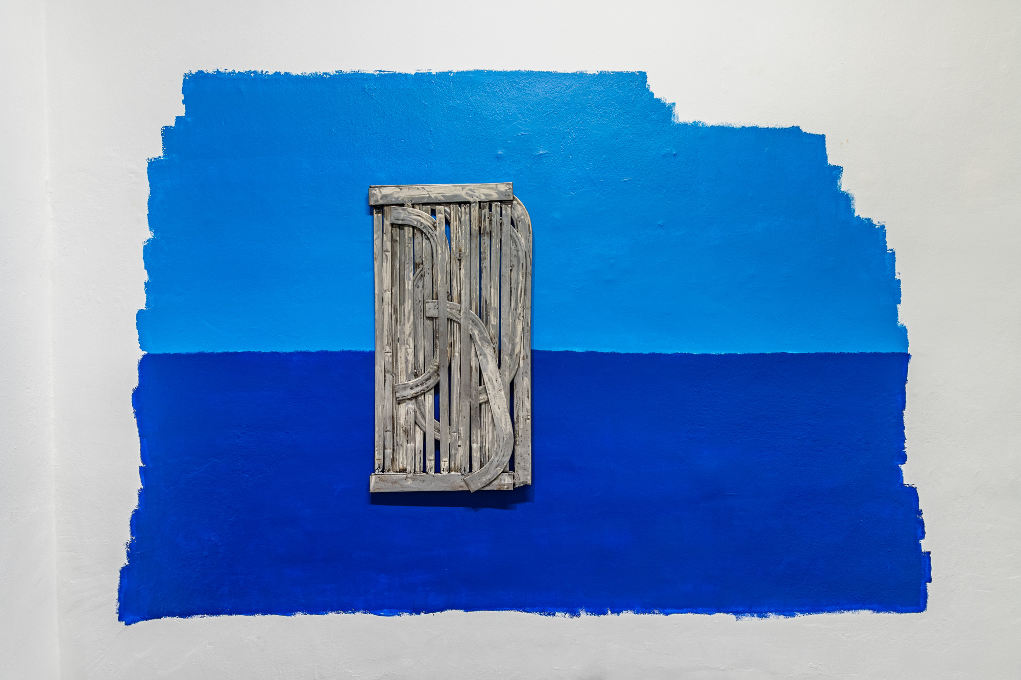 A metal assemblage, pressed and transformed from police barriers, emerges as a gesture of resistance that explores the possibilities of dismantling and reconstructing existing structures. Positioned in front of a wall painted in barrier blue (ultramarine and sky blue) tones, the sculpture invites reflection on the horizon line, the threshold between earth and sky. The barricade irons, broken apart and crushed into a new form, evolve from an obstructive structure into an opening, a newly imagined horizon.