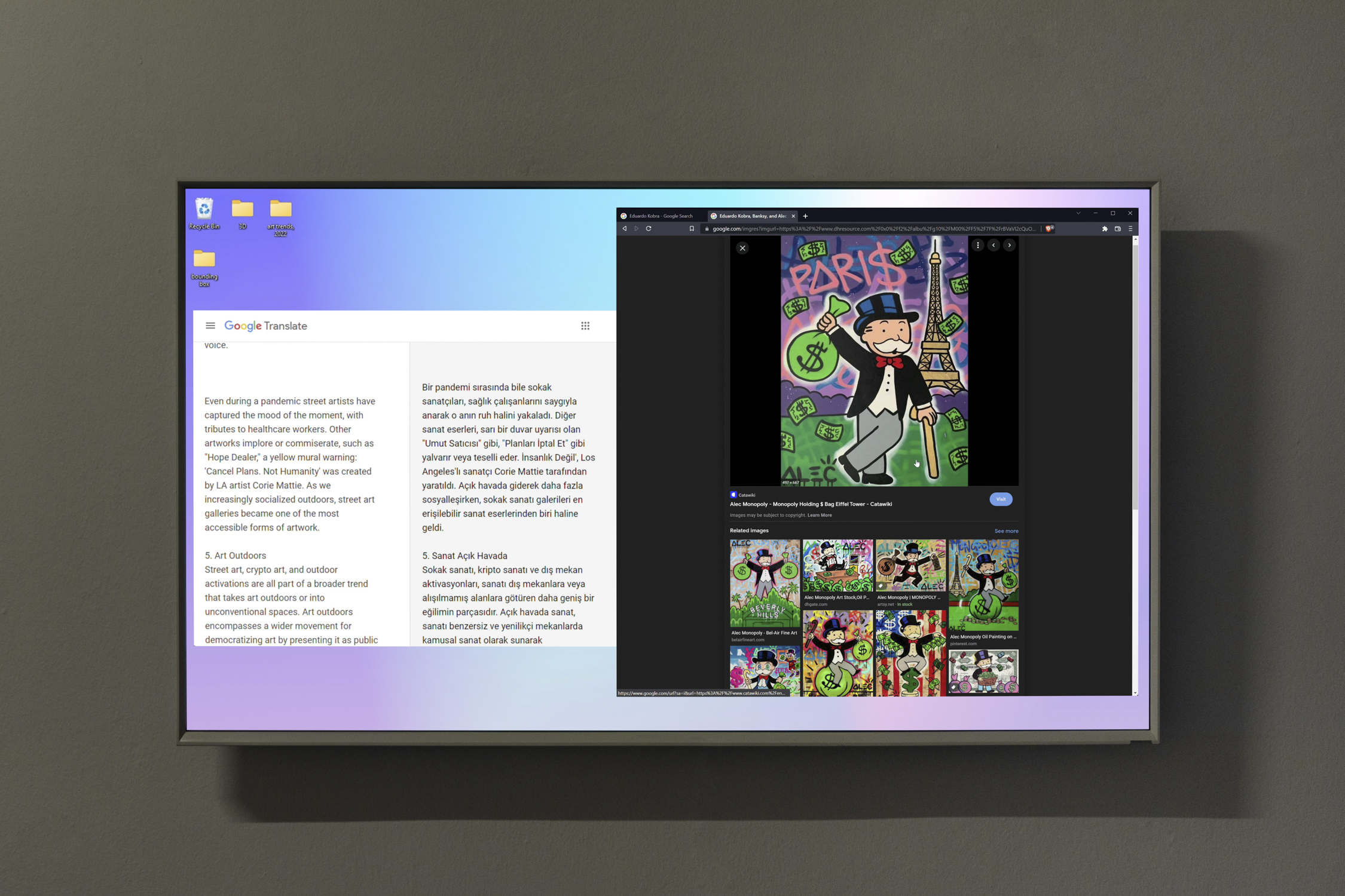 Hacer Kıroğlu’nun Art Trends (2022) isimli video çalışması, sanat dünyasındaki aktörlerin küresel sanat ortamını takip etme çabasının bir izdüşümünü gösterir. Google üzerinden “2022 art trends” araması yapan sanatçı, ulaşılan sonuçları Google translate programında Türkçeye çevirir ve çeviri uygulamasına okutur. Bozuk Türkçeli, aksayan metin; sanatçının içinde bulunduğu coğrafyanın, dil ve kültürün, dünya sahnesiyle arasındaki mesafesini, çeviri arayüzünü yansıtan ekran üzerinden katmanlayarak açar. Sanat pratiğinin önemli bir ayağını oluşturan, tekrara dayalı ve yoğun emek isteyen çalışmalarında Hacer Kıroğlu, insanın öğrenme/yapma/bilgiyi aktarma biçimleri üzerine düşünür. El emeği, kadın emeği, akışta olma hali Kıroğlu’nun temel meseleleri arasındadır. Egemen Tuncer’in çalışmaları ise neredeyse insanın/el emeğinin görünmez olduğu olağanüstü bir pürüzsüzlüktedir. Tuncer’in çalışmaları, makinelerden yardım alır, makinelerin içinde doğar, makineler üzerinden/içinden gösterilir. Bu anlamda bu sergi, iki sanatçının birlikte ama ayrı ayrı düşüncelerini sanat sahnesine taşımaktan fazlasını yapar: insan ve makineler arasındaki karşılıklı ilişkiyi tartışmaya açar, sanat yapmanın biçimlerini ve araçlarını konuşmak ister.