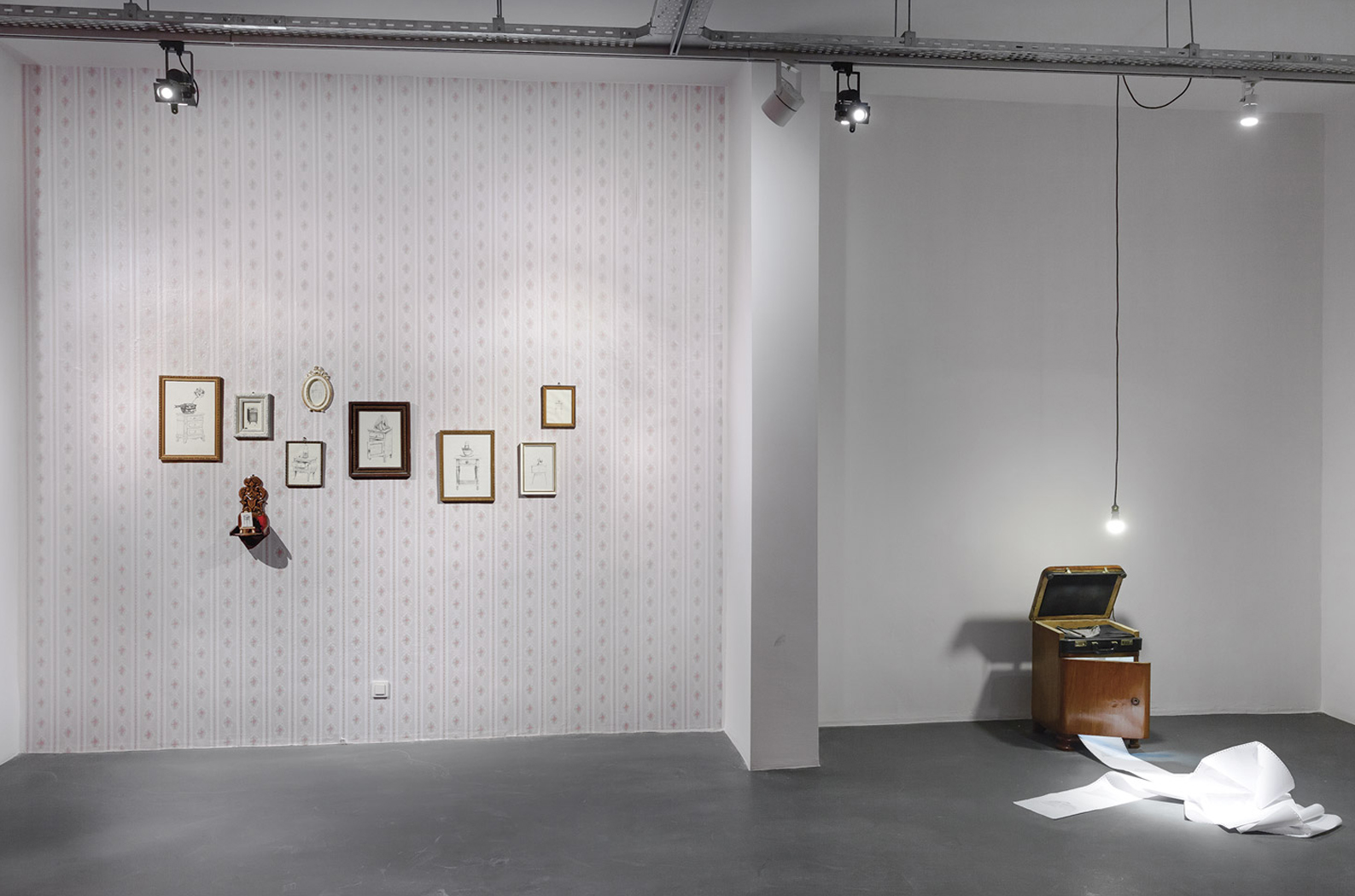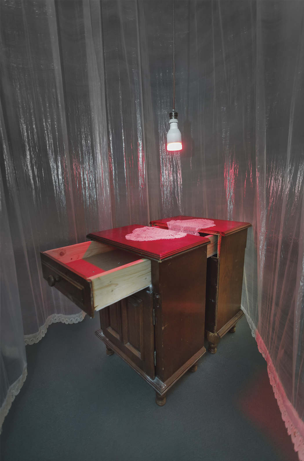 Bireyin yuva ve yuvanın içine yerleştirilen evcil nesnelerle birlikte ehlileştiği fikri, Neslihan Koyuncu’nun eserlerinin temelini oluşturuyor. Koyuncu, ev ve insan arasındaki ilişkiyi irdelerken komodin, ütü masaları ve tülbent bezi gibi evcil nesneleri malzemesi yapıyor. Bu nesnelerin kullanım değerlerinden çok sakladıkları/gizledikleri, eserlerinde açımlamaya çalıştığı konuları oluşturuyor. Sanatçının, bir çekmeceyle birleştirilmiş bavulu, gündelik nesnelerin kullanım amaçlarını askıya aldığı bir anı gösteriyor. Evin erkeğinin, dışarıyla ilişkisi, dışarının hem bir zorunluluk (para kazanma) hem bir kaçış/kaçamak oluşuna işaret ediyor. Çekmecelerin üzerindeki bavul, içinde bir iç çamaşırı gizliyor.